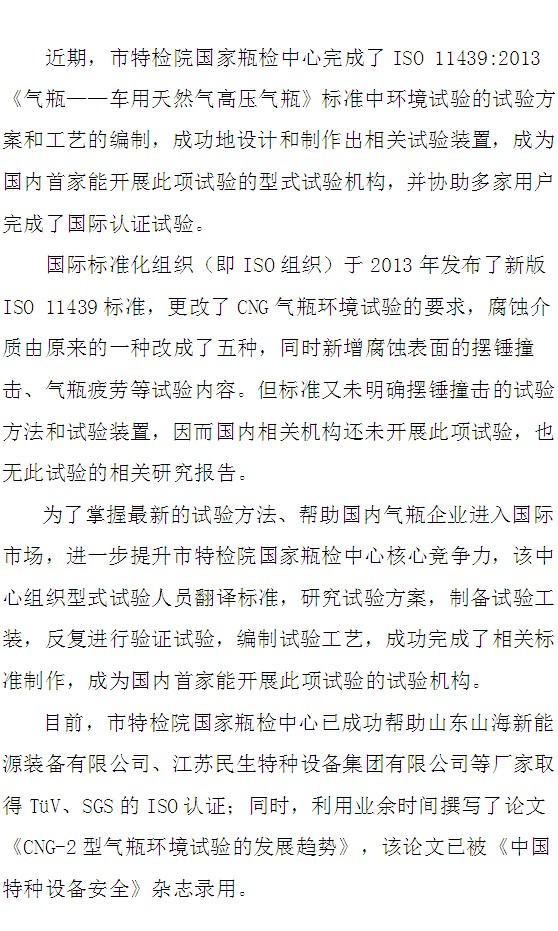 市特检院国家瓶检中心成为国内首家开展ISO 11439:2013标准环境试验的型式试验机构