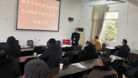 12月17日,机电中心党支部结合“我为群众办实事”开展支部共建,组织全体党员前往高新区金凤镇白鹤村党委服务中心,与白鹤村党支部共过“主题党日”活动。大家汇聚一起开展专题研讨,系统学习党内法规等内容;引导党员发挥先锋模范作用。机电支部书记唐跃林利用PPT、动画视频、图片等方式,生动形象的为白鹤村的党员们讲解了如何安全乘坐电梯及乘梯注意事项,尤其针对老人、小孩乘坐电梯等注意事项做了详细说明。