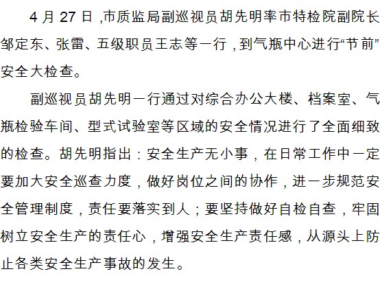 市质监局副巡视员胡先明检查国家瓶检中心节前安全工作
